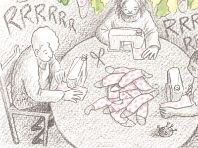 Cette bande dessinée a été écrite en pleine pandémie du Covid-19, quand des millions de masques lavables ont été commandés en urgence en France à des couturières bénévoles par les services de l'État, et que la revue Panthère Première préparait son numéro sur le déni de travail...